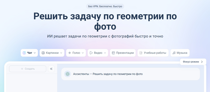 Русскоязычный ИИ-сервис на базе нейросетей, специализирующийся на решении задач по геометрии и другим предметам с возможностью загрузки фото условия. Сервис также помогает с генерацией текстов, написанием эссе, рефератов, курсовых, созданием презентаций и подготовкой к экзаменам.