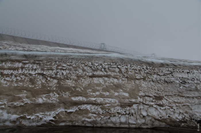 Забор больше от медведей, чем о людей. Снег за лето так и не успел растаять, зимой высота снежного покрова превышает 10-15 метров.