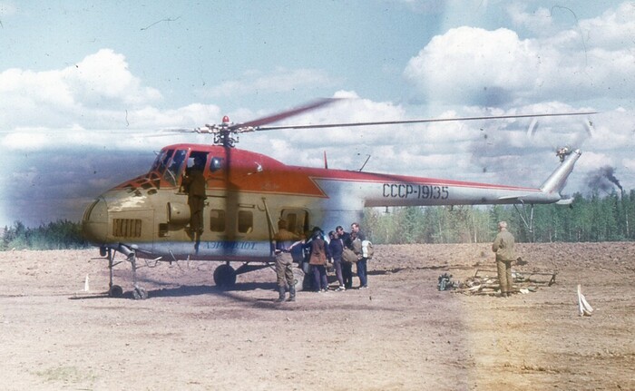 Ми-4 на аэродроме в Ивделе. Народ грузится на борт. Я эти вертолёты уже не застал, летал на Ми-2 и Ми-8, хотя поговаривают, что Ми-4 и до 90-х кое-где дожили.
