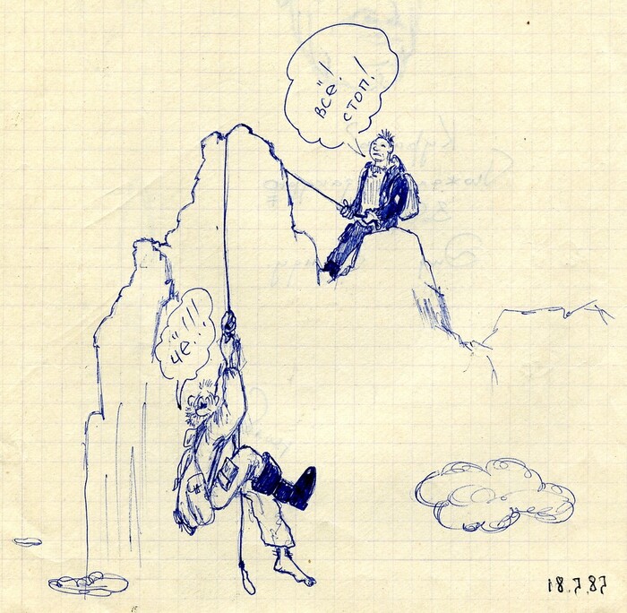 В то время моей фантазии ещё не хватало, чтобы таскать с собой запасной карандаш или привязывать имеющийся на верёвочку, так что нужно было доставать выпавший, чтобы не возвращаться домой с середины маршрута. Вот только как его достать, если улетел он метров на десять вниз в глубокое ущелье с отвесными, гладкими стенами. Покряхтев, я полез в ущелье, растопырившись как Иванушка на лопате у Бабы Яги, а Костя страховал меня мерным шнуром. Минут через пять-десять, которые показались мне пятью, а то и десятью годами, я всё же добрался до вредного пишущего предмета, уютно устроившегося на снеговой подушке. Операция по спасению прошла успешно!