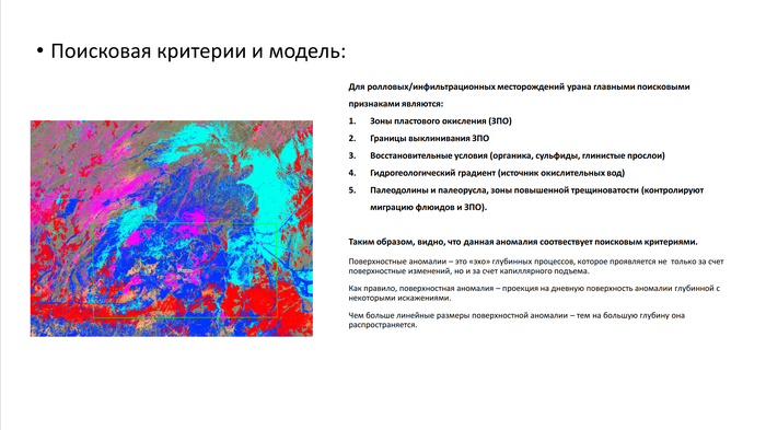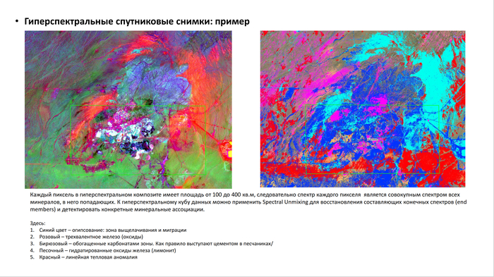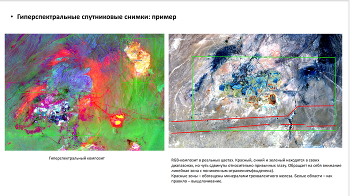 Как найти такие перспективные россыпи? Геологические карты тут не помогут, сами понимаете. Давайте воспользуемся гиперспектральными данным и посмотрим на Хлебопек на композите, где малиновый цвет отражает зоны гипергенеза - производные окисления сульфидов и их миграции, чем он темнее - тем активнее водосток.