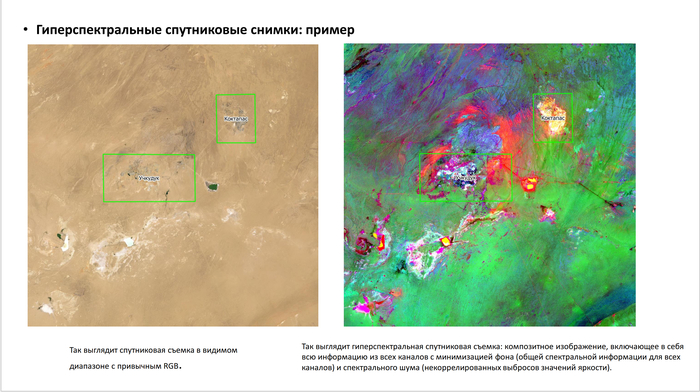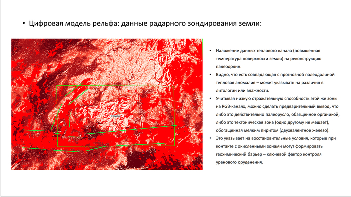 Давайте посмотрим, как эта река выглядит на гиперспектральных снимках: зеленым контуром выделена река Кара, красными контурами - зоны разгрузки кислых грунтовых вод - то есть геохимические барьеры наиболее эффективно работают рядом с ними.