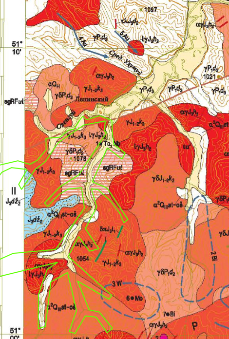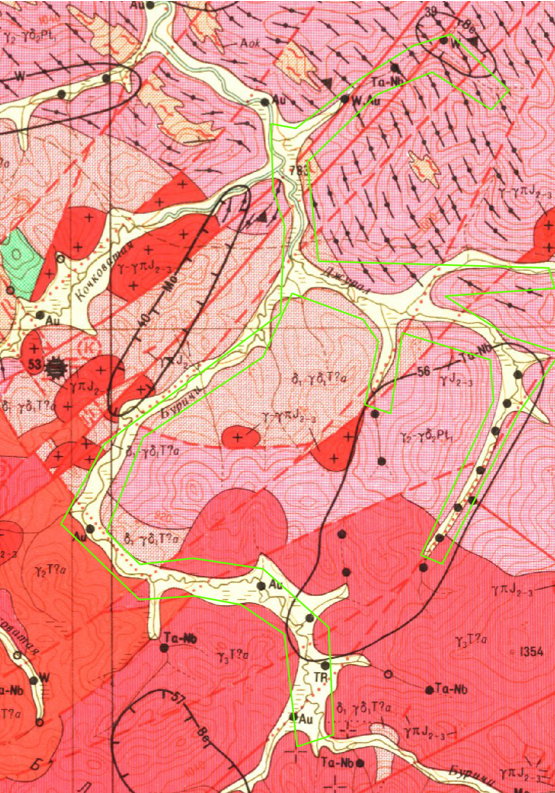 С точки зрения геологии ситуация аналогичная: граниты-гранодиориты, только добавляется гнейсово-сланцевый комплекс с линзами мраморизованных известняков и кварцитов. Обращают на себя внимание на 2 потока рассеяния золота на севере.