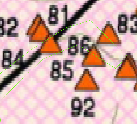 Треугольниками отмечены свалы и высыпки кварца, кварца с пиритом с содержаниями золота порядка 0.1 г/т.