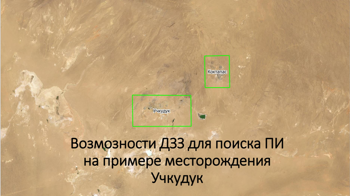 Привлекает внимание площадная зона гипергенеза (из-за облачной дымки оттенки на снимки светлее), которая находится поодаль.
