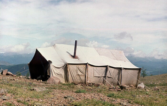 Вместо приличных нар внутри палатки устроили большую лежанку из жердей и еловых веток, укрытых куском брезента, а вместо стола решено было использовать вьючник начальника. Правду сказать, в палатке мы только ночевали, потому что погода была шикарная и практически всё время мы проводили возле столовой, организованной неподалёку.