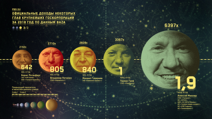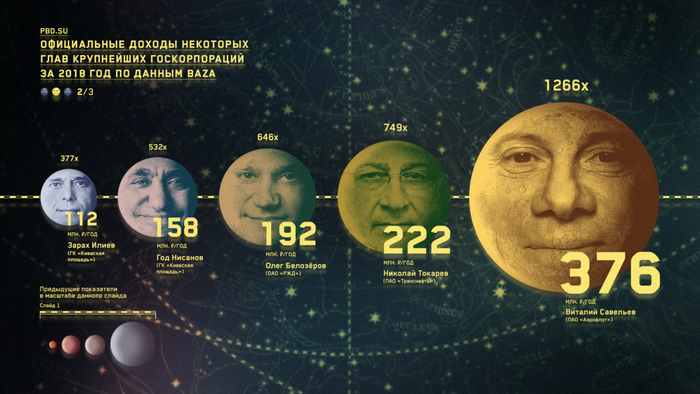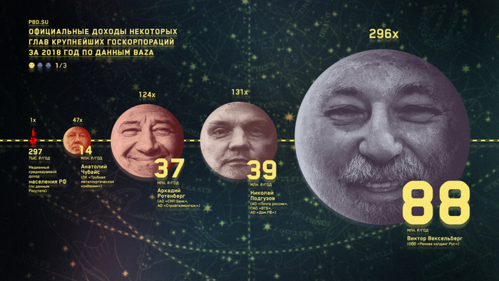 Немного статистики. Журналисты проекта «BAZA» опубликовали официальные доходы руководителей крупнейших госкорпораций России, добытые анонимным сотрудником Федеральной налоговой службы. «Неплохая выборка для инфографики», — подумали мы, но для большей наглядности добавили коэффициенты, показывающие, во сколько раз доходы сильных мира сего превосходят медианный среднедушевой доход населения за тот же год, представленный на сайте Росстата. Медианный доход населения за год получен умножением среднего месячного дохода на 12. В очередной раз подтверждается, что неравенство в РФ достигло космических масштабов, а у наших олигархов коэффициенты выше, чем у любой букмекерской конторы. И это лишь верхушка айсберга, ведь в статье даны только официальные доходы. О реальном положении дел мы можем только догадываться в том числе потому, что отсутствуют данные по многим крупнейшим российским предпринимателям вроде Усманова, Лисина, Михельсона, Мордашова и прочих «Абрамовичей». Потому данная статистика никак не коррелирует со списком богатейших бизнесменов РФ.