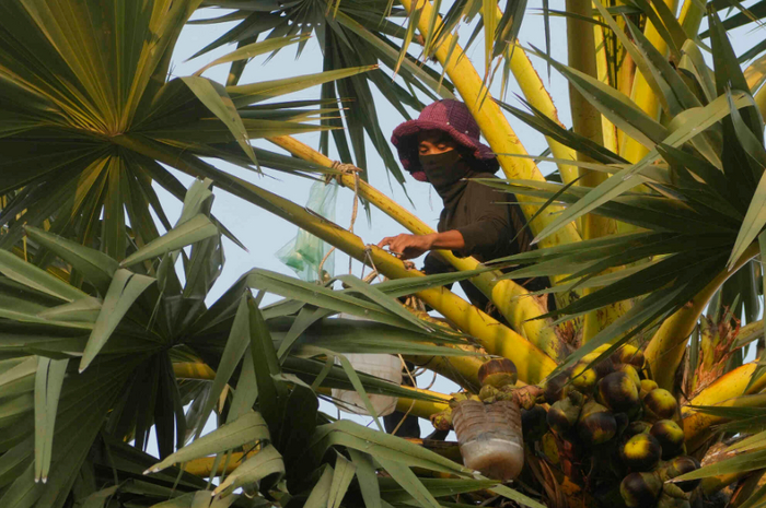 В Камбодже мужик залез на пальму, чтобы собрать сок.