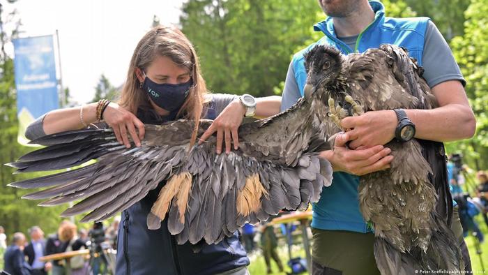 Ягнятников, они же - бородачи, полностью истребили в Баварских Альпах в позапрошлом веке. Сейчас первые две птицы встают здесь на крыло в дикой природе - не без помощи человека.