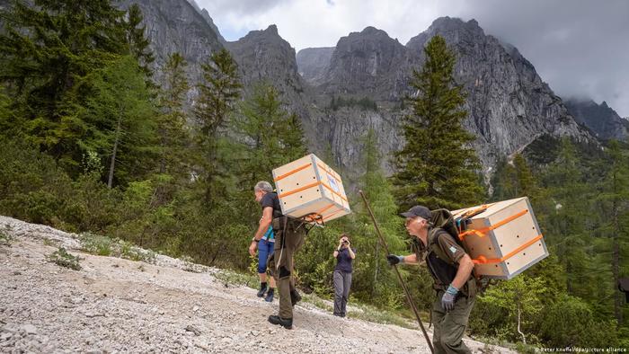 Птенцов, выведенных в Испании в рамках европейского проекта, доставили в горы около месяца назад - несли в специальных боксах. Место выбрали подходящее в национальном парке Берхтесгаден (в том самом, где недавно решили спасти от толп туристов-инстаграмеров живописный водопад), но очень труднодоступное, чтобы никто случайно не помешал. Гнезда сами они строят в расщелинах скал или пещерах на высоте две-три тысячи метров.