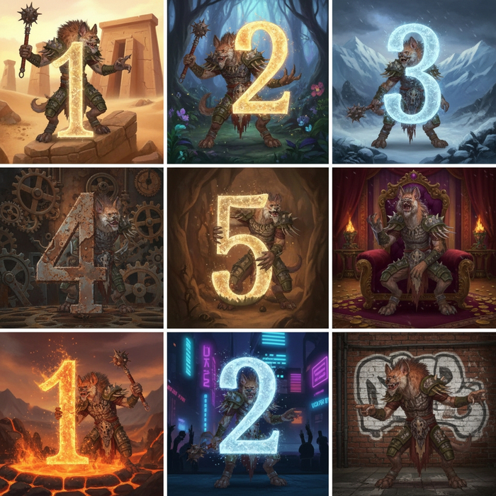 3x3 grid of 9 square panels. each panel has a unique plot. Сharacter from image - Gnoll Marauder from homm 3 (It is important to preserve only the character's face and clothes) in different poses and in each panel, interacting differently with numbers 1, 2, 3, 4, 5, and 6. only ONE digit per panel. numbers may be repeated on different panels. Numbers are clearly visible and don't obscure the character. diffefent background from game Heroes of Might and Magic 3. backgrounds should match the style of the game. High-resolution quality, vibrant colors, clean composition.