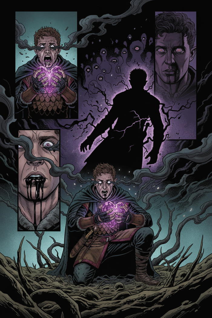 Одна эпичная иллюстрация как хаотичный нарративный монтаж. Не жёсткие панели, а перетекающие друг в друга моменты. Стиль: контрастная графическая новелла, жирные экспрессивные чернила. Локация: декадентское эльфийское казино, золотой свет. Главный герой: персонаж с изображения [Bodger] — он и только он во всех кадрах. ЯКОРНЫЙ ОБРАЗ (центр композиции, низ страницы): [Bodger] сидит за столом, поражён. Крупный план пустых ладоней. ВОКРУГ ЯКОРЯ — НАРРАТИВНЫЕ БИТЫ: - Сделка (верх-лево): получает мешочек денег от фигуры в плаще - Бросок (центр): динамичный кадр, кричит в экстазе, кости и монеты в воздухе - Проигрыш: крупный план костей на столе — проигрышная комбинация - Ужас: лицо [Bodger] искажено в широкоглазом шоке - Грабли: рука крупье сгребает последние монеты - Насмешки: призрачные лица эльфов-игроков смеются на фоне РЕЖИССЁРСКАЯ ЗАМЕТКА: Не сетка — поток. Свет, тень и расположение ведут глаз от Сделки через хаос к финальному образу пустых рук.