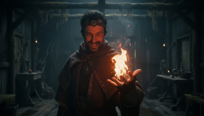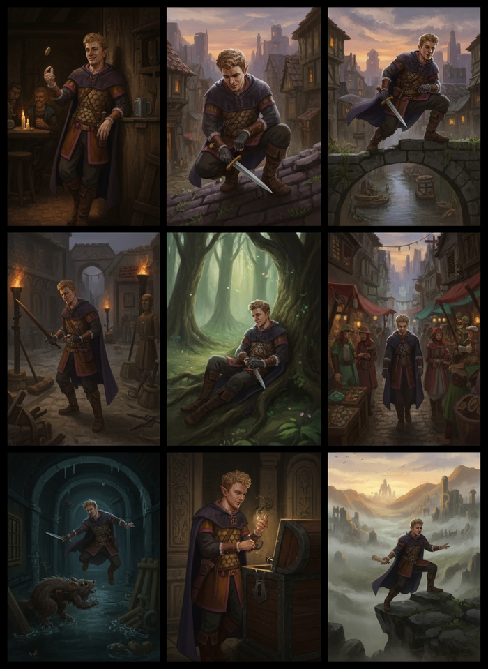 Здесь у нас просто текстовый промт. Нейросеть "держит" одного персонажа и размещает его в разных локациях. Но абстрактный маг не так интересно.