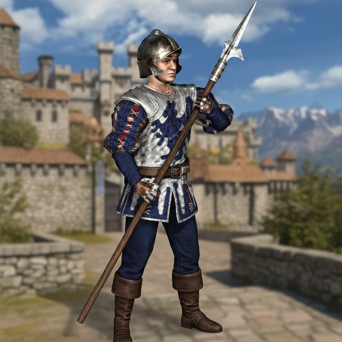 3x3 grid of 9 square panels. each panel has a unique interesting plot. Сharacter from image - spearman from homm 3 (It is important to preserve only the character's face and clothes) in different poses (sits, stands, trains, fights, etc.) and in each panel diffefent background from game Heroes of Might and Magic 3. backgrounds should match the style of the game. High-resolution quality, vibrant colors, clean composition.