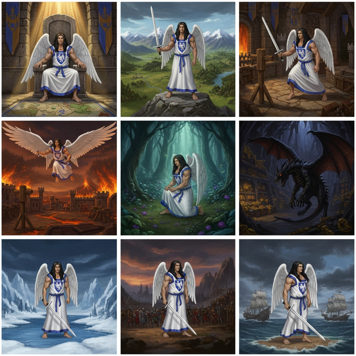 Берем тот же промт с разными позами. Покажу результаты на основе ангела. Можно заметить, что не все картинки получились теми, что нужно. Но учитывая что у нас их 9 шт, пара неудачных можно просто не брать.