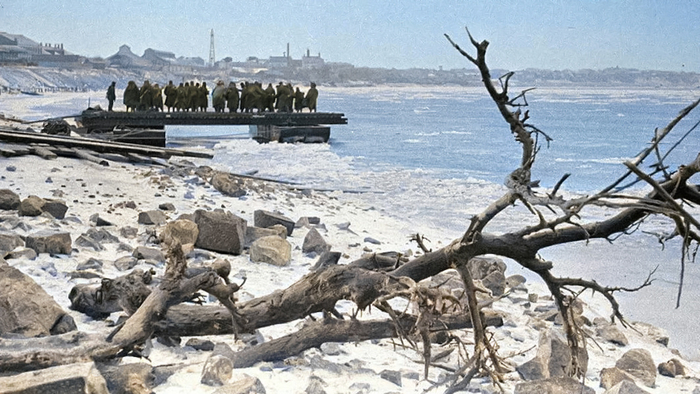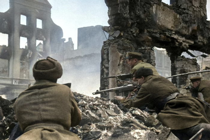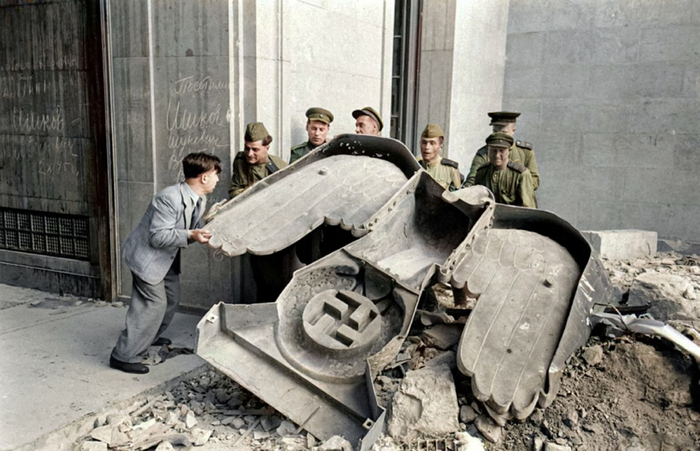 Берлин. 1945 год. 30 апреля. Командир полка Фёдор Зинченко вызывает красноармейцев Мелитона Кантарию и Михаила Егорова и, показывая на Рейхстаг, отдаёт приказ водрузить на него Красное знамя…