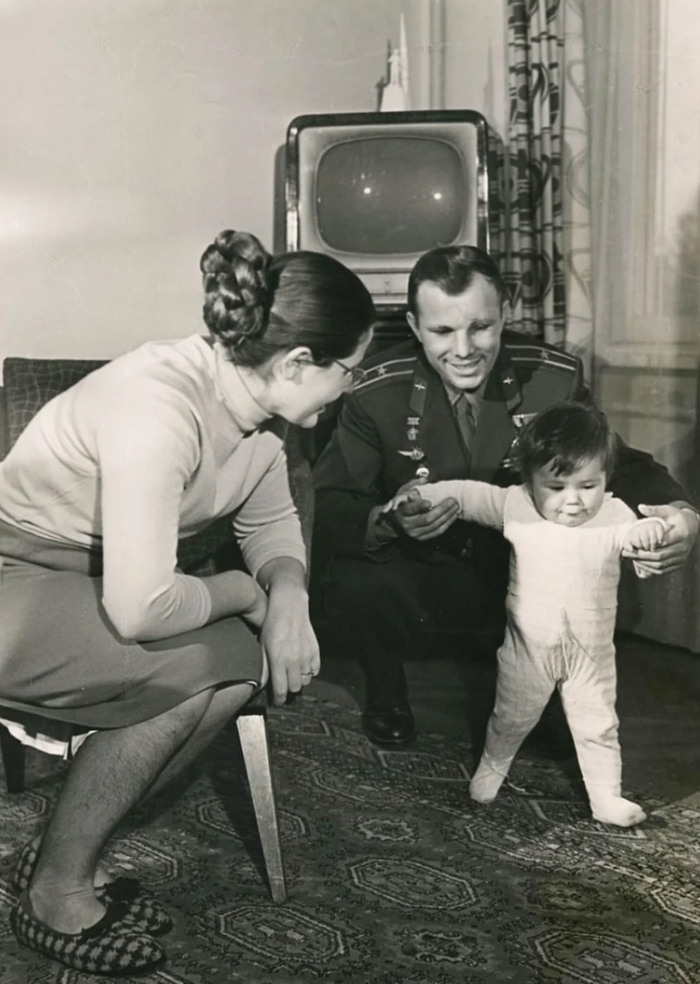На этом фото можно увидеть и еще несколько подарков, которые Юрий Алексеевич получил за своей космический полёт: телевизор «Рубин» и ковровую дорожку. Но телевизор с ковром — это лишь малая часть перечня из Указа. По них Совмин выделил: — полную меблировку будущей квартиры, всех комнат (и несмотря на то, что квартиру Юрий получил на 5 лет позже, все было выполнено); — бытовую технику: радиолу «Люкс», холодильник, стиральную машину, пылесос; — пианино; — 2 одеяла и 6 комплектов постельного белья. Удивительно, да, увидеть столь простецкие в наше время вещи? Но тогда это все было ценным и дефицитным. Даже для летчиков-испытателей и космонавтов. А, и еще была выделена денежная премия в баснословную сумму 15 тысяч рублей (зарплата у Гагарина была 515 рублей, и даже она была фантастической для большинства граждан).