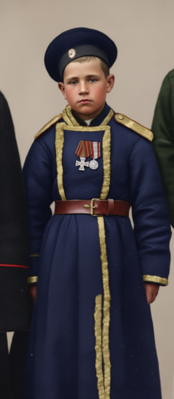 Огонек Еженед. худож.-лит. журн.. 1915, № 20. — 1915. На фото: 1) М. Гончаров, убит. 2) А. Задворнов, ранен. 3) Н. П. Лиходкин, 16-ти лет, контужен. 4) Борис Павлов, ранен, произвед. в ефрейторы. 5) Д. И. Шапиро, 13 лет, награжден Георгиевским крестом 4-й степени, был дважды ранен и вернулся на позицию. 6) 12-летний венгерец, отбившийся от своих родных и поступивший волонтером в наш санитарный отряд. 7) Закржецкий, 9 лет, был ранен и вернулся в свой полк в Галицию. 8) Юный доброволец с рождественскими подарками. 9) Петр Иванов (Петя Статулевич), произв. в мл. унт.-оф., ранен. 10) Б. В. Белоусов, ранен под Сарыкамышем. 11) Ю. Ган, ранен. 12) А. В. Краснопев, 14 лет, контужен, награжден Георг. кр. 4-й степени. 13) П. В. Феодоров, ранен. 14) В. С. Поливанов, был ранен и контужен, вернулся в полк, произведен в унт.-офиц. и награжден Георг. крестами 4-й и 3-й степеней. 15) Степан Моисеенко, 14 лет, ранен под Перемышлем, нагр. Георг. кр. 4-й ст. и Георг. мед., произведен в унт.-оф. 16) Федор Хренов, 14 лет, ранен под Варшавой, предст. к Георг. кр. 4-й степени. 17) Н. Морозов, 12 лет, ранен, произведен в унт.-оф., бежал через дымовую трубу из германского плена, куда попал во время боев под Лодзью. 18) Вл. Коровкин, ранен, вернулся в полк. 19) Степа Кравченко, 10 лет, награжден Георг. кр. 4-й степ. за спасение пулемета, был дважды ранен. 20) Николай Смирнов, 13 лет, Георг. кавалер. Был в плену у немцев, откуда бежал, принеся ценные сведения.