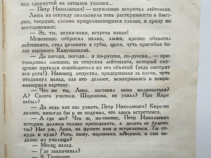 В мою сторону тоже полетела граната... Я помню горячую волну, которая упруго прошлась по мне, только потом, после этого услышал взрыв... И всё. Я уцелел. А потом я увидел своего второго фашиста. Они же даже не окапывались, так, залегли в траве... Он заслонил для меня все, я отчетливо увидел его каску, прищуренные глаза, – мы же неслись со стороны солнца. Всё длилось несколько мгновений... Направленный в мою сторону автомат, который дергался от выстрелов в его руках, закатанная по локти серая форма... Он в меня не попал, а я достал его, как раз под каску, как учили. Попадешь по каске, оглушишь, конечно, но тут будет риск, что пролетишь мимо врага, а он тебя в спину расстреляет...