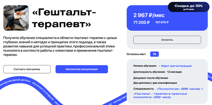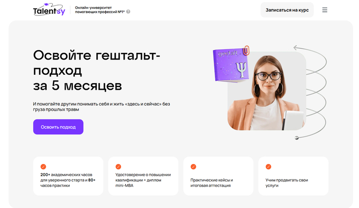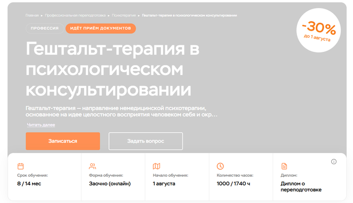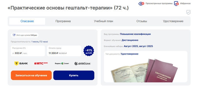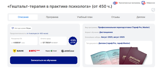 Это курс переподготовки с официальным дипломом, разработанная крупной компанией сферы интернет-образования в России. Он построен на сочетании теории и интенсивной практики: в программе предусмотрено 198,5 часов тренингов, воркшопов, работы в парах и тройках под руководством действующих специалистов с научными степенями. Преподаватели — кандидаты психологических и педагогических наук, специалисты в КПТ, семейной терапии и клинической практике. Учащиеся проходят методики гештальт-подхода, разбирают кейсы, получают обратную связь и проходят итоговую аттестацию с внесением диплома в реестр ФРДО.