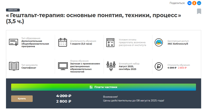 Кому подойдет: действующим психологам, консультантам, коучам и другим специалистам, уже ведущим практику и желающим внедрить гештальт в работу.