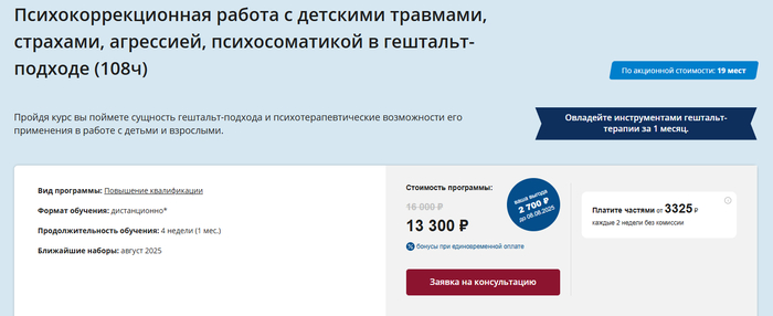 Курс профессиональной переподготовки подойдет тем, кто стремится освоить гештальт-подход для работы с эмоциями, внутренними конфликтами и переживаниями клиентов. В программе собраны материалы от практикующих специалистов, авторские методики и вебинары с неограниченным доступом. Обучение длится четыре месяца, проходит полностью дистанционно и сопровождается поддержкой личного куратора. По завершении выдается диплом установленного образца с регистрацией в ФИС ФРДО.