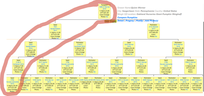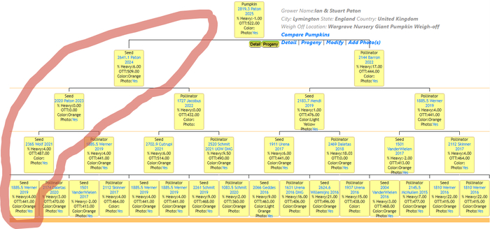 В догонку к публикации про список мировых тыквенных рекордов. Все не так однозначно, как может показаться! Я решил немного пощелкать родословную актуального мирового рекорда. Напомню, это тыква весом 1278 кг, которую вырастили в 2025 году. Вот её родословная — http://tools.pumpkinfanatic.com/PumpkinsSeedGenetics.php?PN=2819.3 Paton 2025. Я смотрел только материнскую линию.