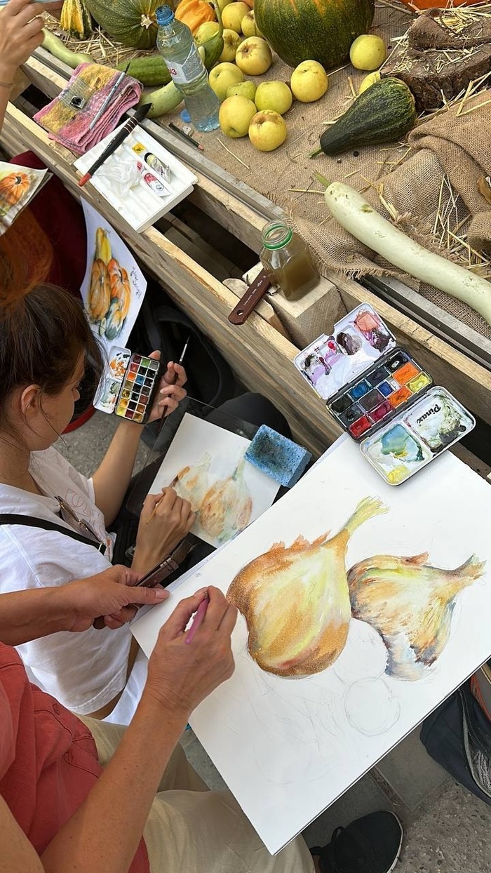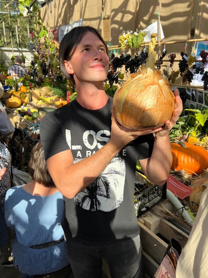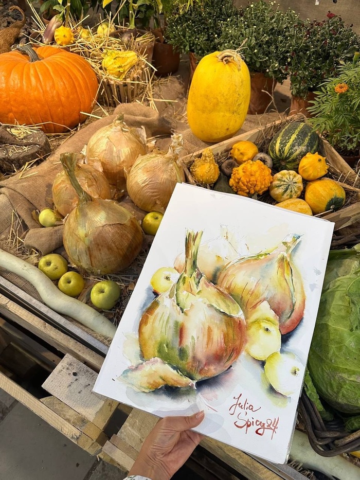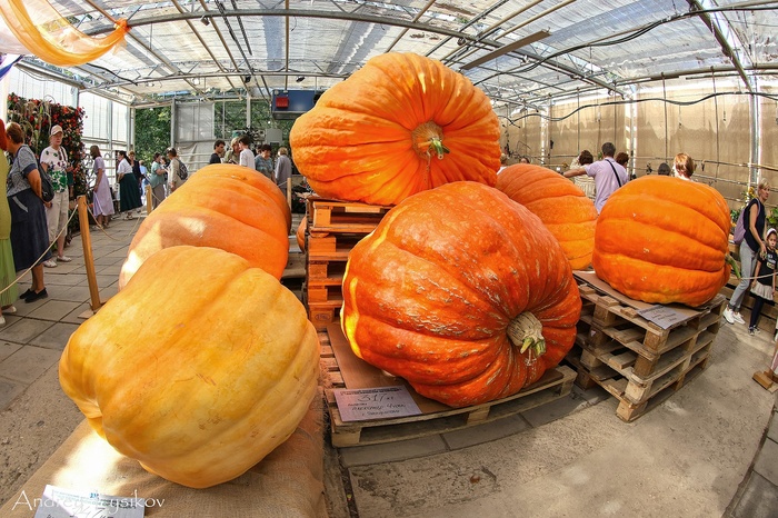 В выходные людей было очень много. Очередь выстраивалась на вход в сад и на вход в оранжерею. Хочу отметить, что две самые большие тыквы не влезли в выставочную оранжерею и находятся недалеко от нее, за углом. Кроме фотографий люди приходят и для занятий по живописи. Самые большие луковицы уже успели увековечится в картинах.