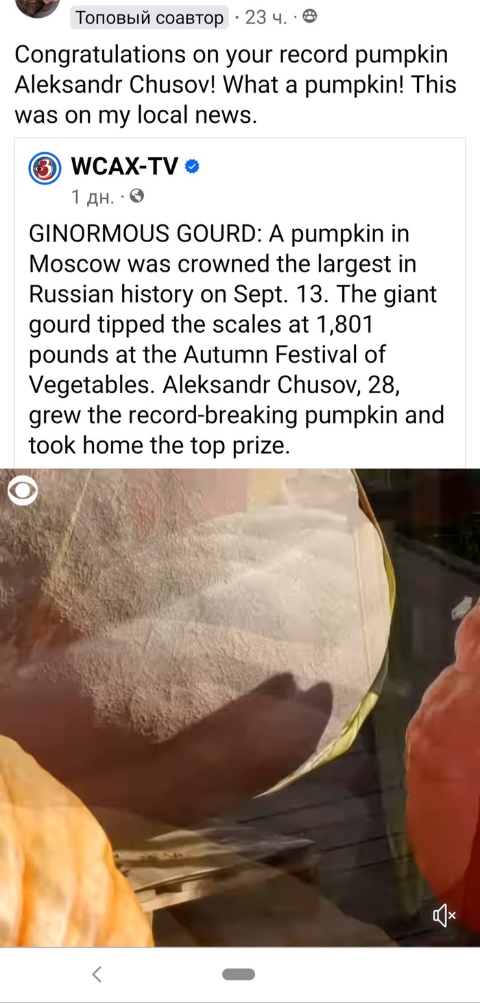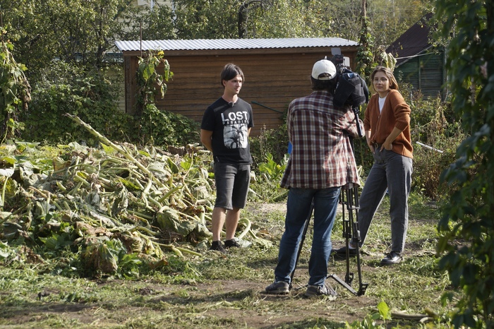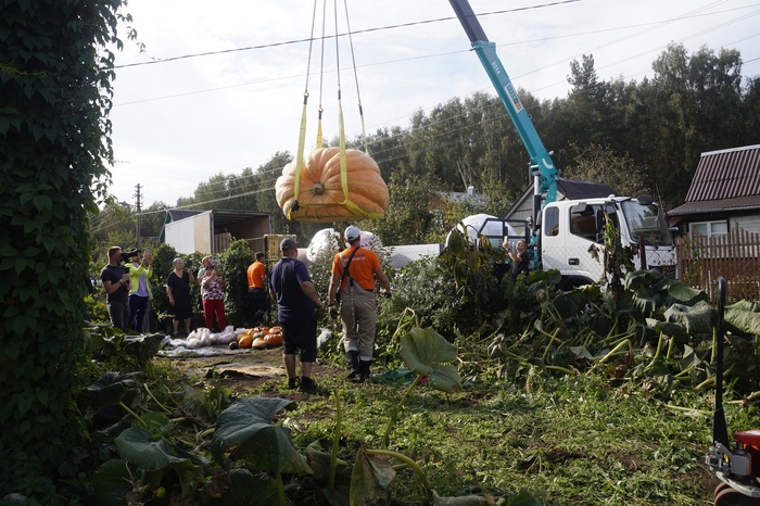 Вывоз тыкв и взвешивание было назначено на 13 сентября. К этому времени я расчистил путь к тыквам и принялся томительно ждать. Накануне мне писали разные СМИ, которые хотели заснять вывоз тыкв. Больше всего меня позабавило то, что с канала ТВЦ мне написали сразу три разных человека. Об этом, конечно, я им сообщил, но меня стали уверять, что все нормально и это просто разные передачи. Ну ок, как говорится. Правда, когда приехали 2 группы с одного телеканала, они стали с друг другом выяснять, а какого фига они тут делают.