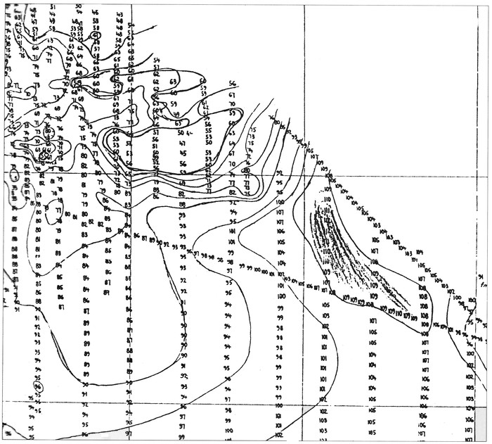 Копия части планшета представлена на рисунке 3. Шесть галсов основного покрытия очень четко показывают область мелководья. На этот счет существуют определенные правила. Для обследования должны быть выполнены дополнительные полевые работы в виде проложения ряда близко расположенных промерных галсов для полного обследования района.