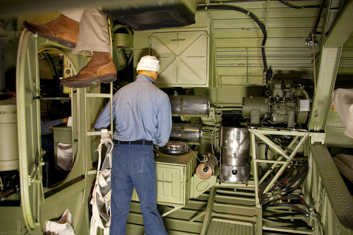 Койки, камбуз и запасы провизии обеспечивали работу экипажа в дальних полетах или на удаленных базах. Видим ноги бортинженера.Кок жарит яичницу.
