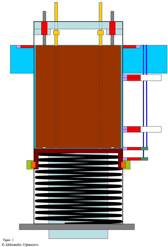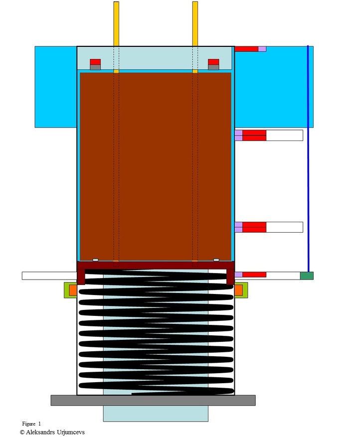 Нижнюю чась пружины закрепим на жёстком основании, а внутри пружины через техническое отверстие в основании установим рычаг, одним своим концом соединённый с поршнем, а другим концом уходящим наружу из механизма и соединящимся где-то там либо с приводом генератора, либо с другими механизмами, чтобы снимать с нашего механизма усилие и совершать полезную работу.