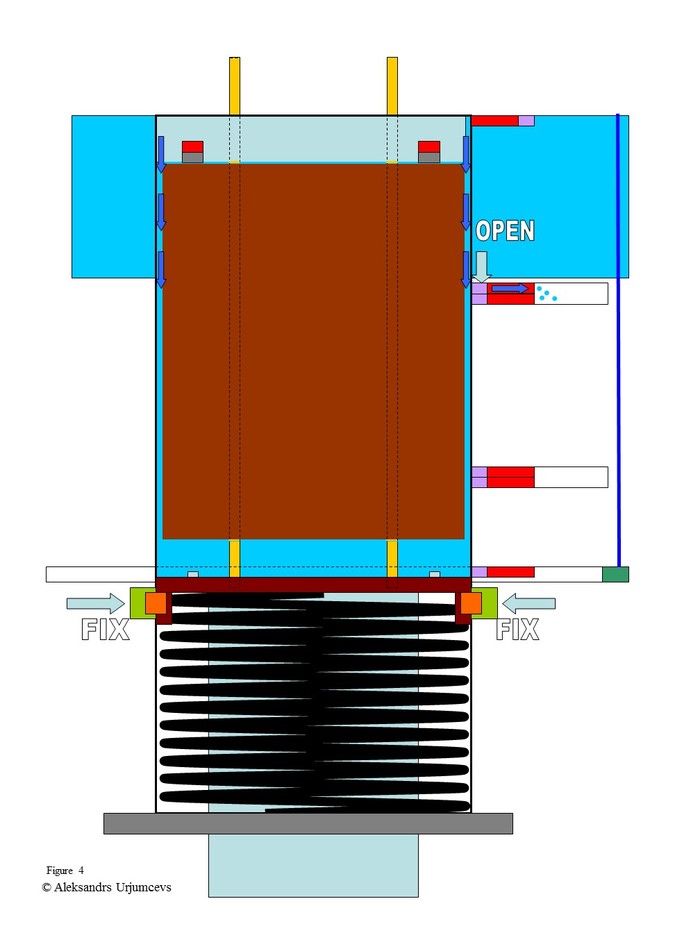 Далее, рисунок 5, когда уровень рабочей жидкости в сосуде снова выровнялся с уровнем жидкости во внешнем сосуде, т.е стал максимальным, снимается фиксация с поршня.