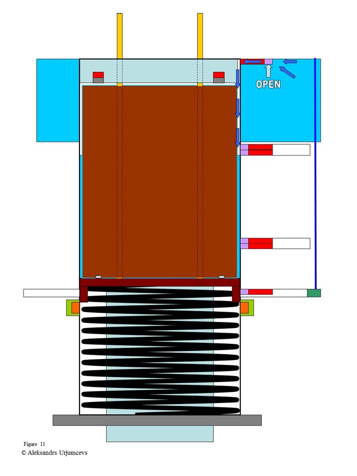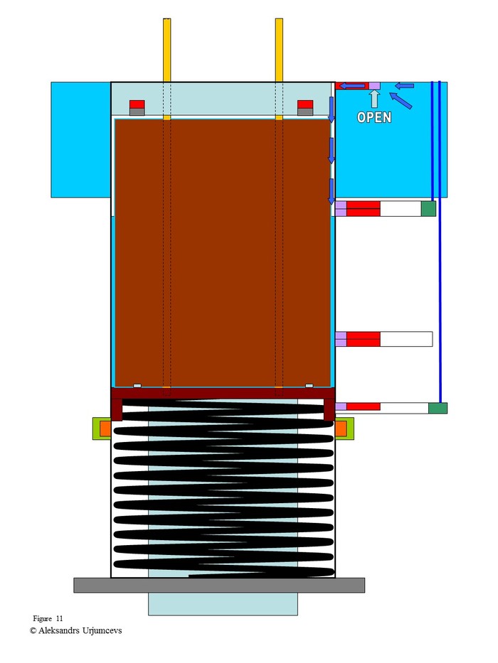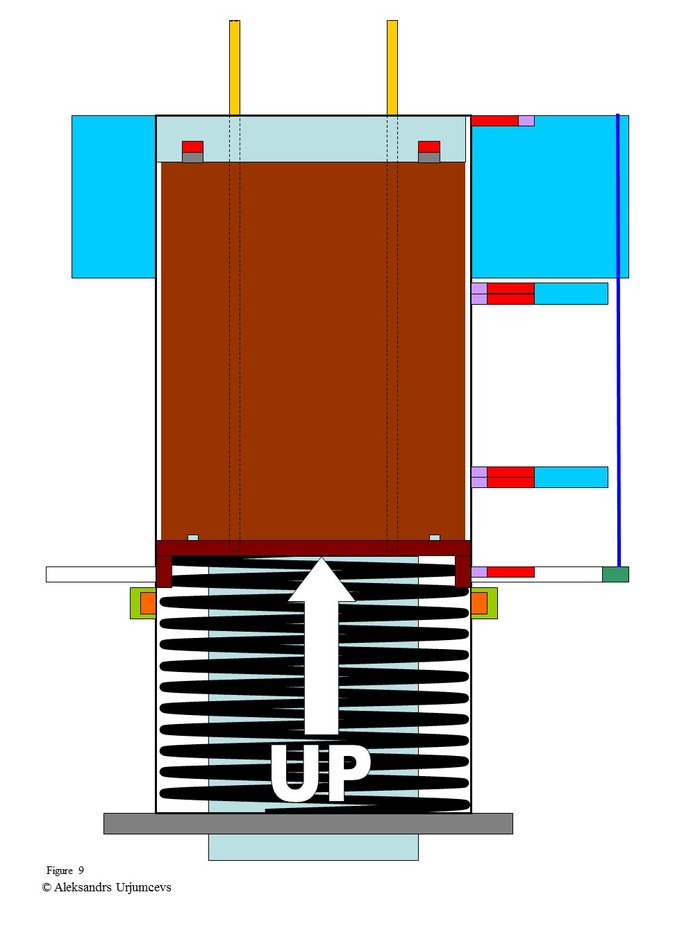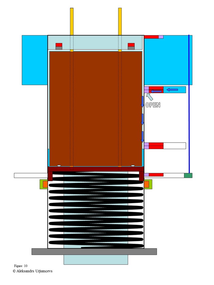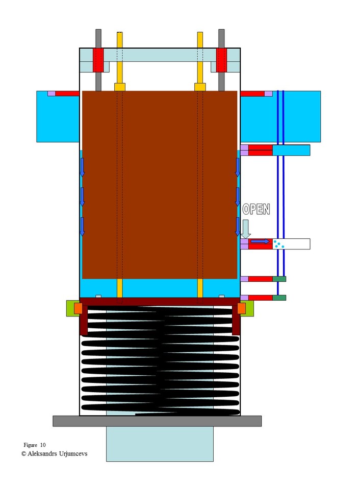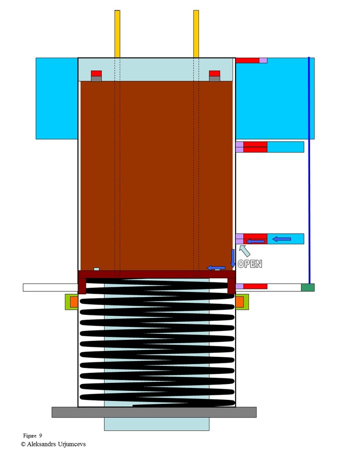 Далее, рисунок 9, сжатая пружина пружина толкает поршень вместе с поплавком вверх, так же толкая рычаг, закреплённый снизу за поршень, и рычаг делает полезную работу, к примеру вращает привод генератора или передаёт усилие на любой другой механизм.