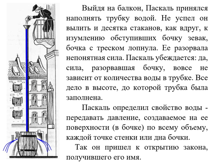 Далее мы напомним читателю, как примерно выглядели бочка с трубкой из опыта Паскаля.