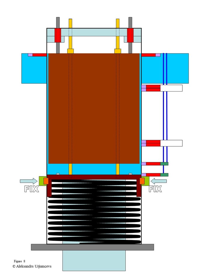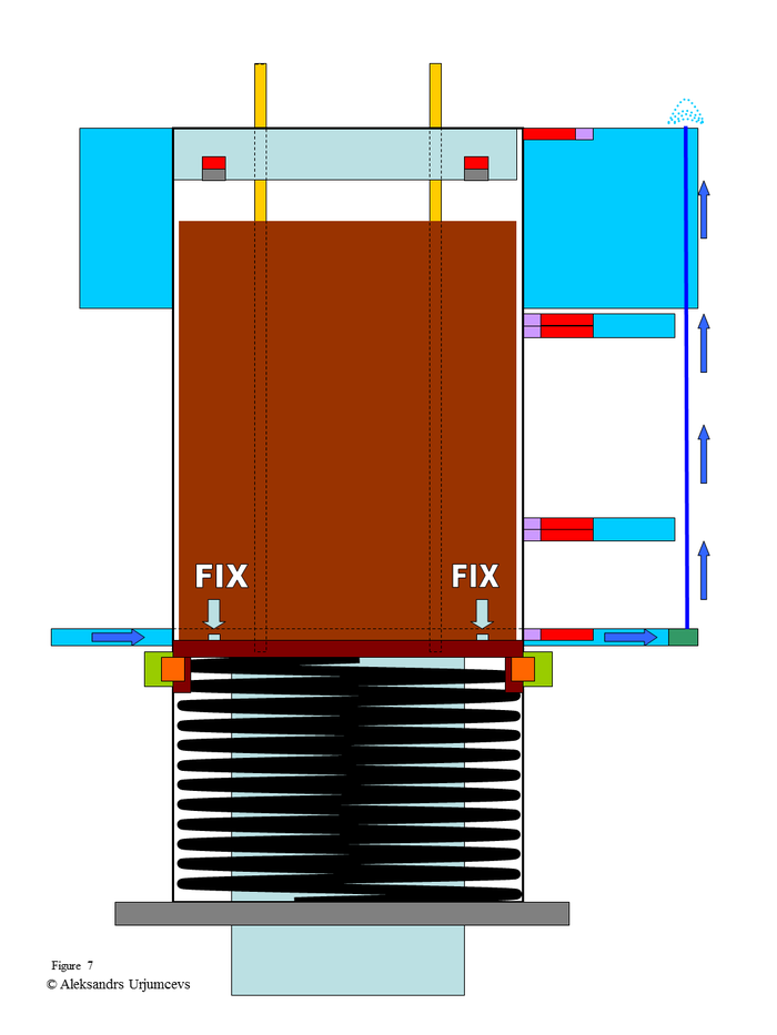 Внимание!!! Как видно из рисунков 4, 7 и 8, высота столба жидкости за счёт поступления дополнительной жидкости увеличилась лишь немного, и поступление внешней жидкости в механизм не является главной действующей силой, а больше нужной для поддержаия нужной высоты столба жидкости, хотя, тоже какое-то влияние на прогиб пружины несомненно оказывает.