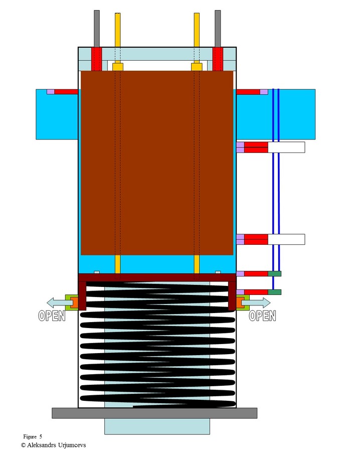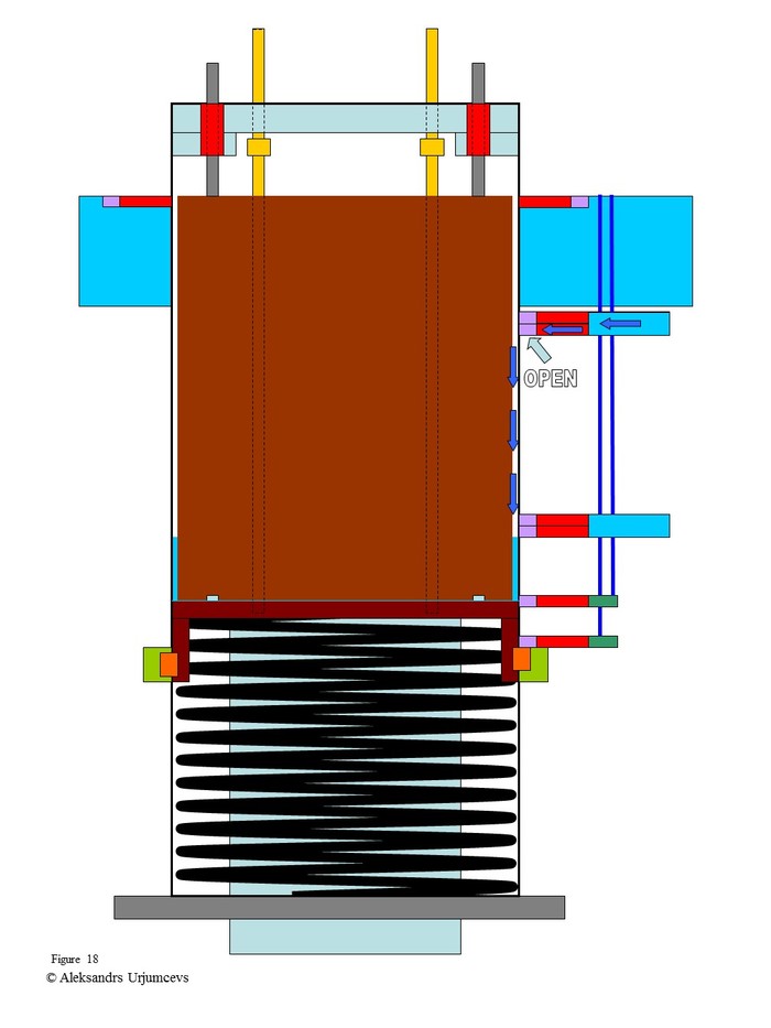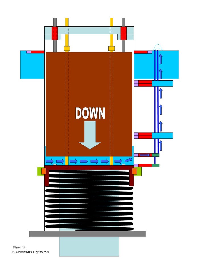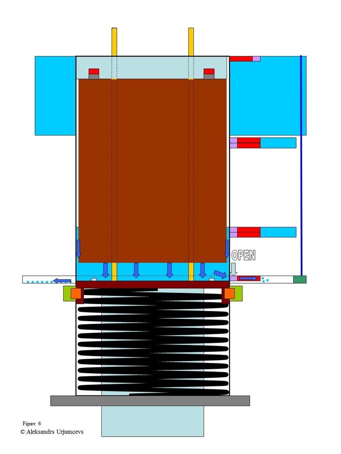 Далее, рисунок 6, под давлением столба жидкости, который к тому же возрастает, пружина, удерживающая поршень, прогибается и поршень опускается вниз.