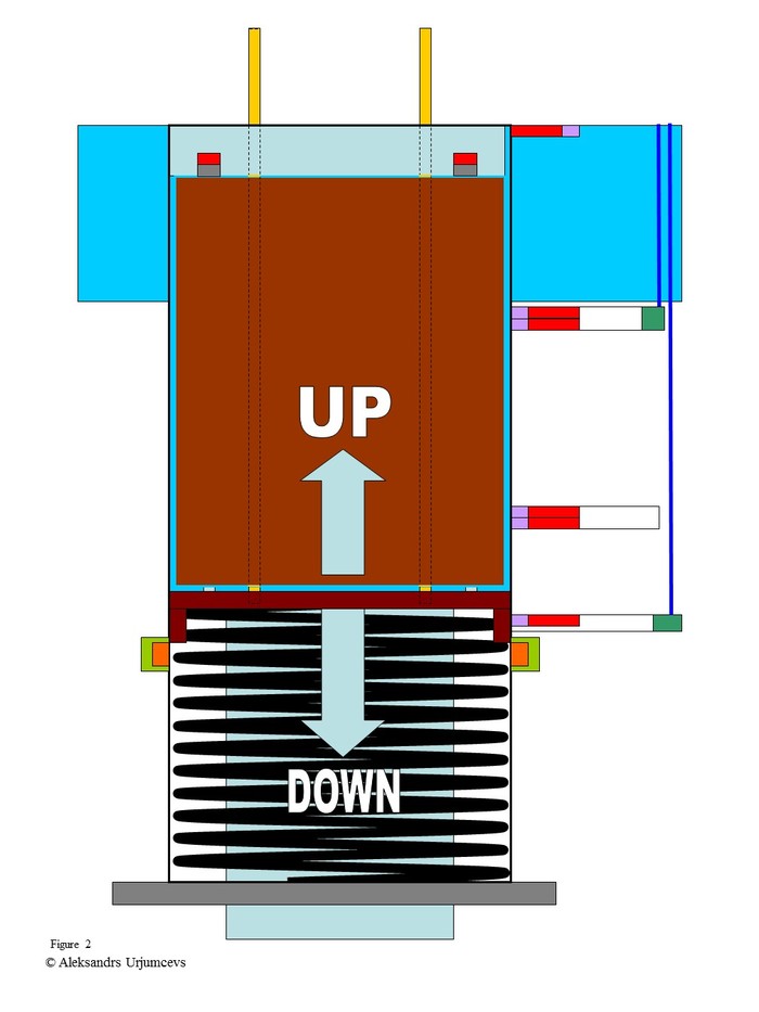 Справа же усилие, которое пойдёт на сжатие пружины и при возвращении пружины в исходное состояние и следовательно при подъёме поршня обратно так же позволит нам получить энергию или выполнить другую полезную работу.