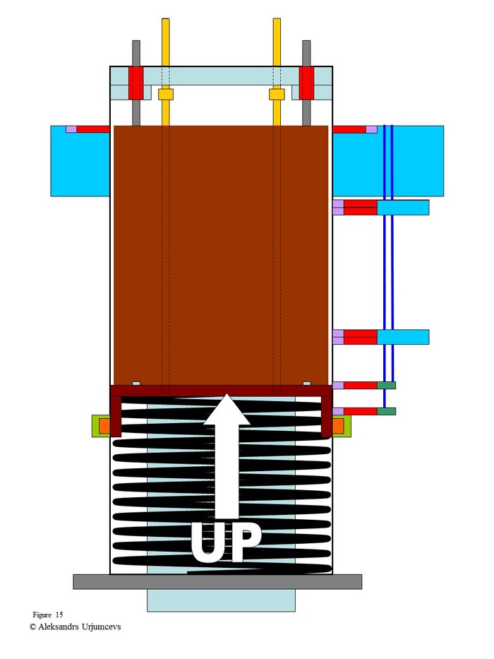 Далее, рисунок 15, сжатая пружина пружина толкает поршень вместе с поплавком вверх, так же двигая рычаг, закреплённый снизу за поршень, и рычаг совершает полезную работу, к примеру вращает привод генератора или передаёт усилие на любой другой механизм.