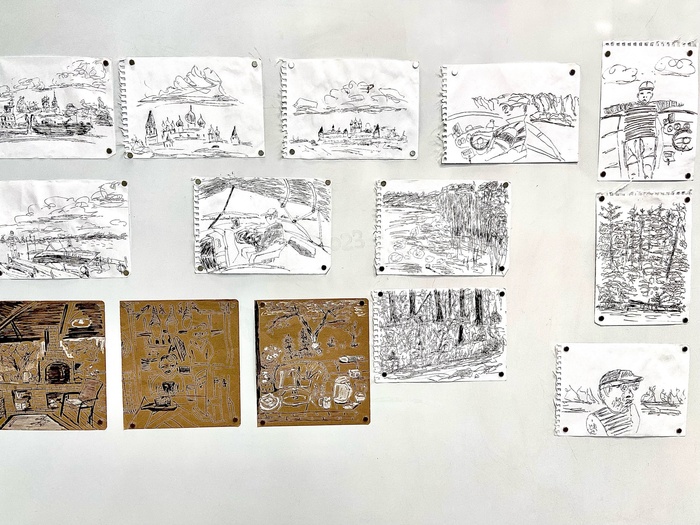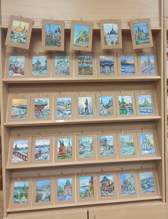 Выставка наполнена впечатлениями о путешествиях по России. Нижегородская область - это Воскресенское Поветлужье-Нестиары, Артемовские луга с их просторами, Ростов Великий с его храмами, сам Нижний Новгород с закатами. И, конечно, дети и прабабушка художницы, как самая большая ценность семьи.