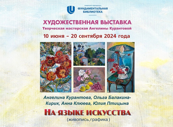 "На языке искусства" (живопись, графика). Творческая мастерская Ангелины Курантовой. Открыта выставка картин нижегородских художниц: Ангелины Курантовой, Ольги Балакиной-Кирик, Анны Клюевой, Юлии Птицыной.