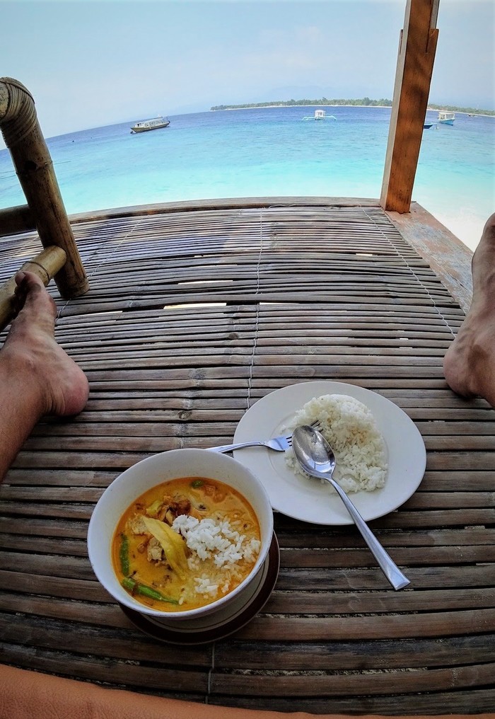 Пока ждали в порту лодку - снова заказывал карри. Забыл сказать, что за всю поездку тут был самый вкусный. Как мне потом рассказали, потому что всё делается на месте вручную. Может и правда поэтому. В общем. Гили - один из тех островов с картинки. единственное, чего не видно, что песок не мелкий, фактически видны небольшие кусочки кораллов. Но, это не очень расстраивает )