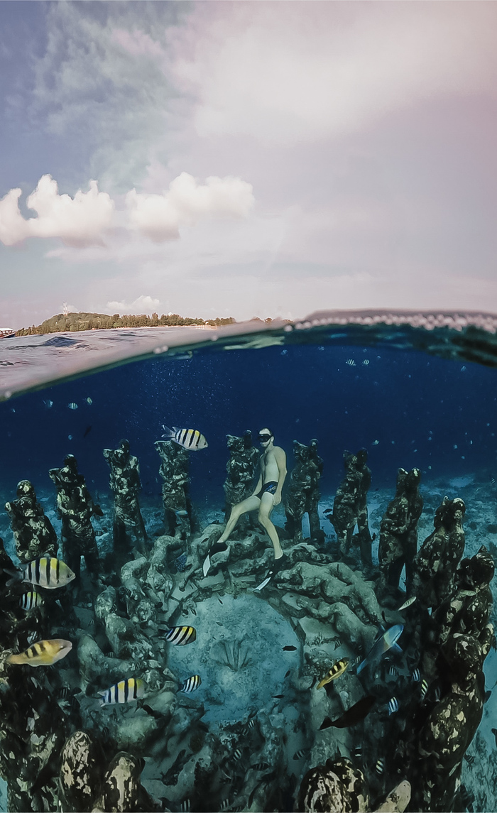 Затем мы направились к знаменитым подводным статуям - Гнездо (Nest). Это было что-то необычное — под водой стояли десятки человеческих фигур, которые со временем покрываются кораллами и становятся домом для морских обитателей. Статуи представляют из себя 48 фигур в натуральную человеческую величину. Плавать среди этих подводных статуй было завораживающе, словно я оказался в подводном музее.