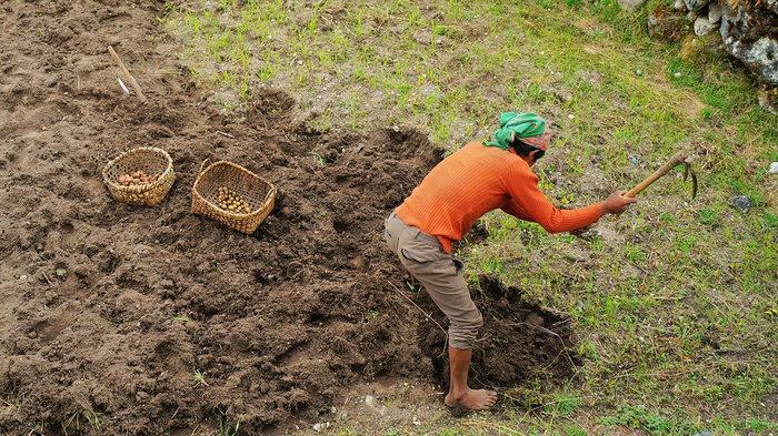 Как я упомянул выше, Кумджунг - нетуристическая деревня, здесь довольно много сельхоз. участков. Картофель в этих местах весьма популярен для выращивания. Я не очень разбираюсь в этой теме, но, кажется, застал как раз посадку. Рабочий день был в разгаре. Над этим трудилось довольно много людей и даже молодых ребят и девочек, которые выполняли что-то типа функции "принеси, подай, иди нафиг не мешай". Совсем мелкие не принимали в этом участие и просто ковырялись в земле обычными палками, я даже свое детство немного вспомнил :)