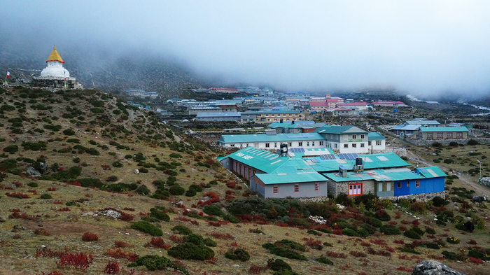 Мой план встретить рассвет в красивом месте накрылся туманом. Не смотря на то, что проснулся очень рано, за час-полтора до рассвета, так никуда и не пошел. Провел у окна несколько часов в надежде что туман рассеется. Уже давно рассвело, но туман никуда уходить не собирался. В итоге я и задремал от скуки на пару часиков. А когда проснулся, то внезапно обнаружил за окном прекрасную солнечную погоду. И, чтобы не бездельничать, решил повторить акклиматизационный маршрут, который мы уже проходили ранее. Предстояло подняться наверх к отелю "Everest View" и далее в поселок Кумджунг. Это было очень кстати, так как Кумджунг гораздо менее туристический, чем Намче и расположен довольно близко, но примерно на 350 метров выше. Быстро собравшись, отправился в дорогу. Время, которое было уже далеко не раннее, также пошло на пользу, удалось избежать больших толп туристов, которые тоже идут этот трек. Маршрут начинается с весьма значимого перекреста в Намче. Одна дорога ведет наверх - в местный аэропорт, деревню Кумджунг и отель Эверест Вью, другая является продолжением классического маршрута к Эвересту, еще одна часть огибает весь поселок Намче и ведет к вертолетной площадке, и еще одна ведет к школе, музею нац. парка Сагарматха и, непосредственно, в сам Намче. Не удивительно увидеть здесь огромные камни Мани, большой молитвенный барабан и другие атрибуты непальской культуры.