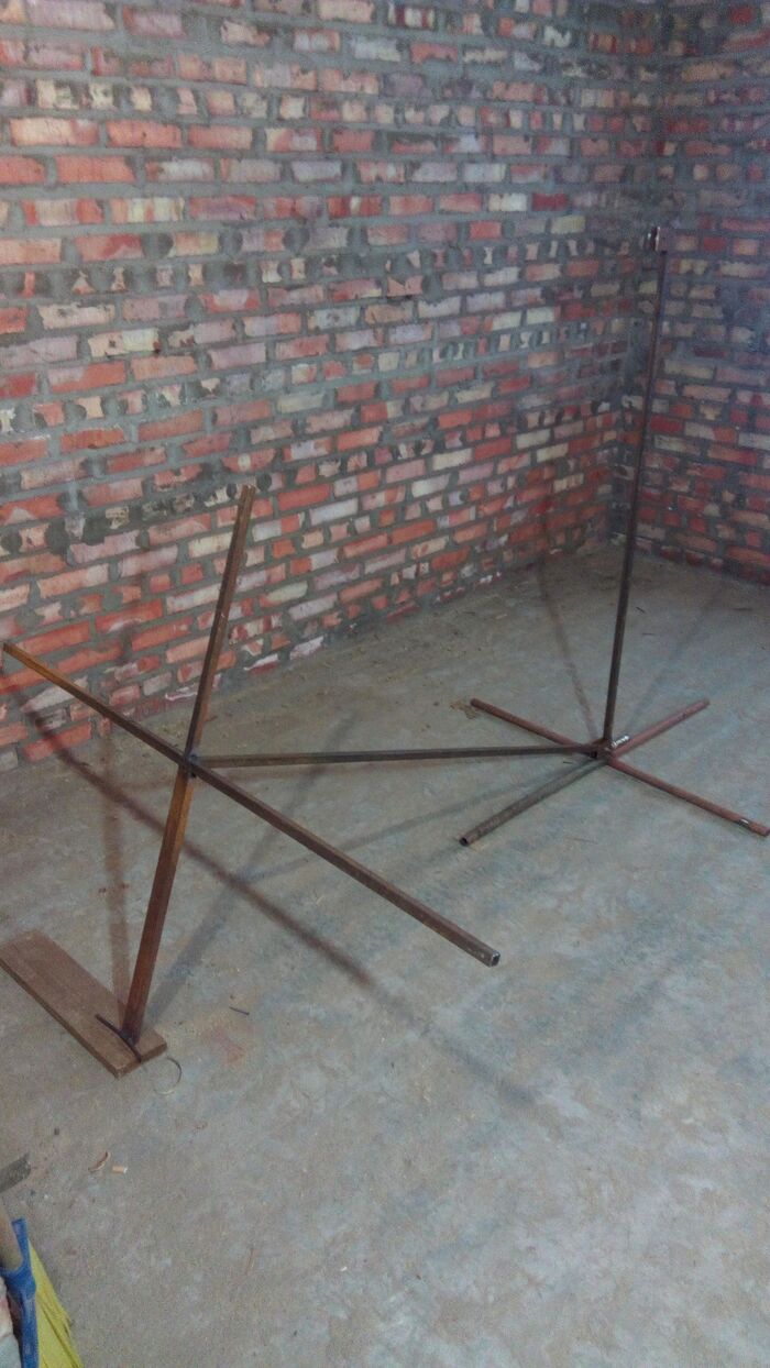 На болт 1 надеть что-либо для удобства. За него поднимается верхняя крестовина. Также им осуществляется блокировка конструкции в верхнем положении закручиванием. При затягивании болт упирается в нижнюю крестовину, болт вкручивается в приваренную к скобе широкую гайку или в пару обычных гаек, сваренных вместе. Болт 2 вкручивается в верхнюю крестовину, служит петлёй для её наклона в нижнем положении. Болт 3 вкручивается в верхнюю скобу вплотную к верхней крестовине. служит ограничителем чтобы в момент подъема верхняя крестовина не упала. При наклоне верхней крестовины в нижнем положении болт убирается.