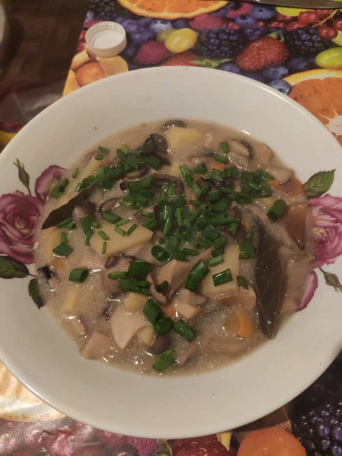Я вот не особо люблю вареные овощи, но считаю, что грибной суп должен быть именно с варёным луком и морковью. Рецепт прост: грибов прям целый котелок (у нас он на 8 литров, уварятся на 70 процентов они), 2 кг картофеля на 8 литров, 4 моркови крупных, 2 крупные луковицы, лавровый лист, соль и 0,5 л сливок. Зелень по вкусу. В идеале - на костре, но так как мы в пути снимаем домики, не всегда есть даже вода. Всем полных корзин!