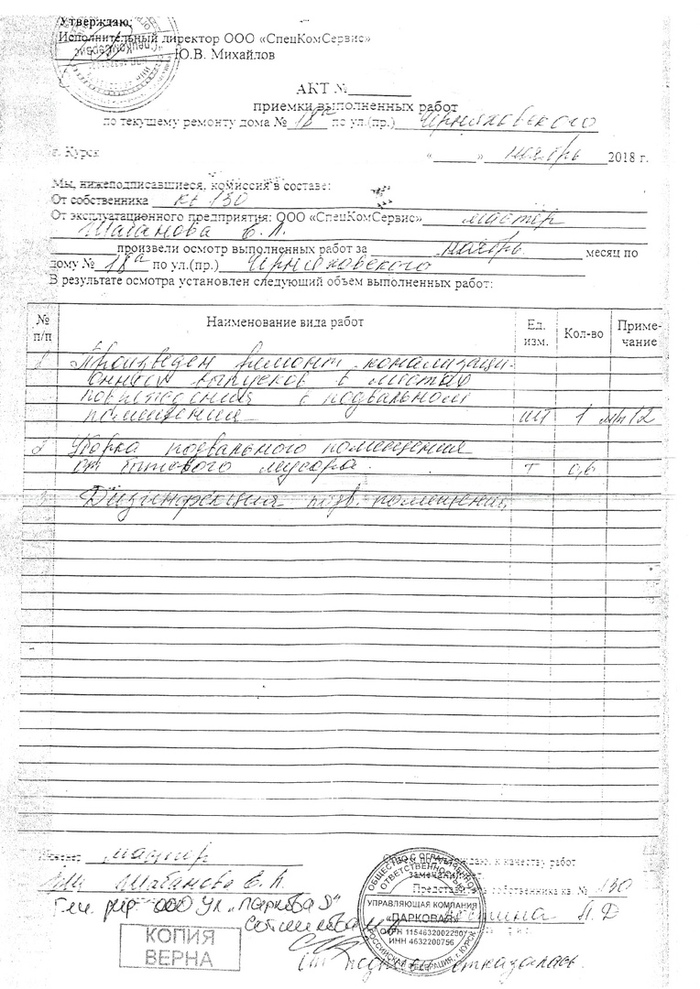 Что не так с этими актами? Давайте разберемся. Во-первых, они не имеют даты. На одном акте от подписи собственник отказался, на другой стоит подпись собственника, который, как оказалось, является действующим работником этой компании и «липовым» председателем Совета этого дома. Совпадение?