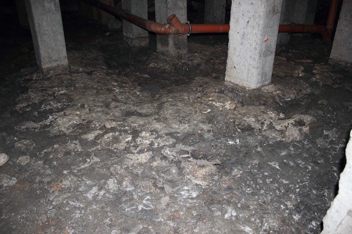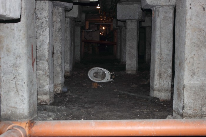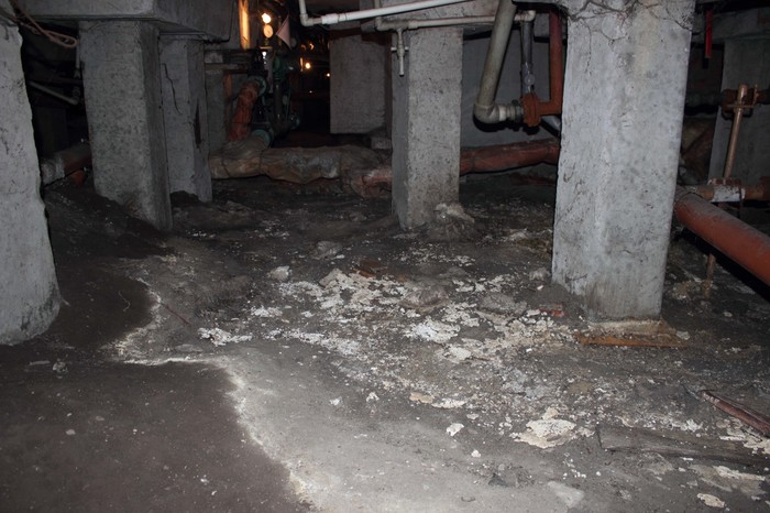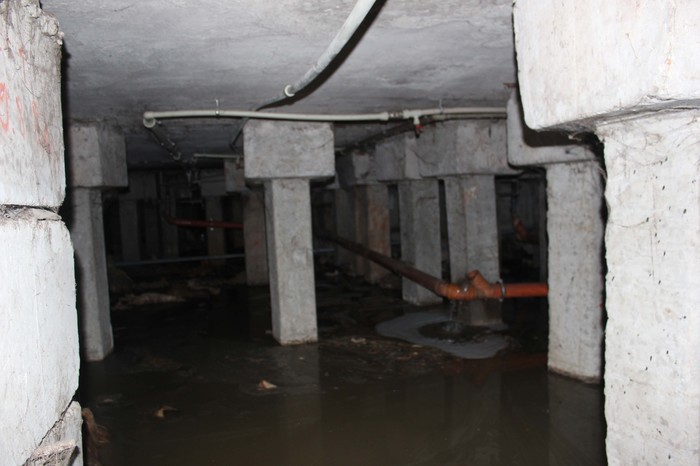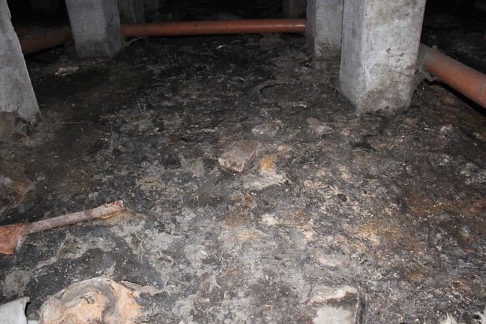 Каловое застывшее озеро. Очень едко пахнет, запах ощущается у подъездов, на первых этажах, в квартирах на первых этажах, распространяется по трубам квартир. Коррозии в трубах, дырки, ржавчина, неправильные углы канализационных труб, из-за чего каловые массы и стоки вытекают и затапливают подвал. Общее состояние подвала удручающее, жуткая антисанитария. Трубы горячего водоснабжения и отопления без теплозащиты, из-за чего идет большая потеря тепла.