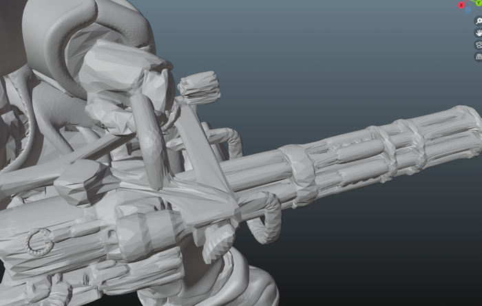 Даже имея очень кривую 3D модель на руках, иногда дешевле доработать её, чем делать с нуля (правда это редкость, обычно наоборот). Начал я с модификации пушки гаусса. Утолстил часть элементов (провода, ручку, оптический прицел и прочее), но дальнейшие опыты в изготовлении показали, что конструкция сама по себе хрупкая (ствол длинный и тонкий) и пушку захотелось поменять на что-то понадежнее. На пулемет.